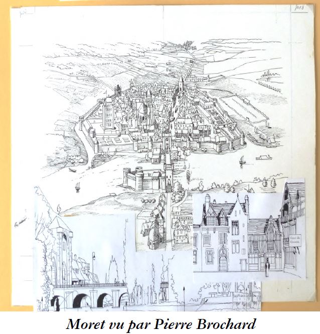 Les estampes que nous faisons voisiner ici offrent deux regards sur la ville de Moret : celui des topographes de l’époque classique et de l’architecte du XXe siècle, soucieux de restituer fidèlement la réalité ; celui de l’illustrateur Pierre BROCHARD, dont les dessins ont enchanté l’enfance des plus âgés d’entre nous.